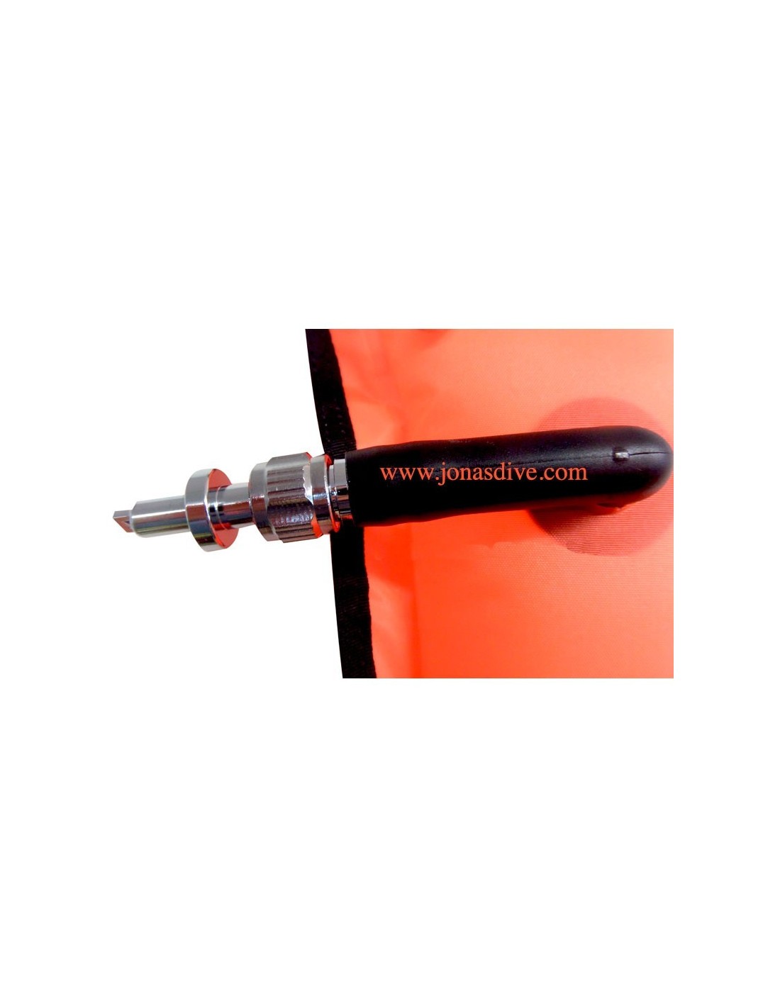 Dispone de válvula de sobre presión con tirador e inflador accionado mediante inflado oral y mediante el latiguillo de inflado. El conector no se puede bloquear con el latiguillo, evitando de esta manera la posibilidad de enganche y la peligrosidad que esto podría acarrear.