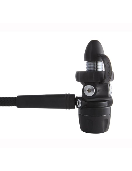El anillo metálico frontal de la segunda etapa, la tuerca prensaestopas y la tapa del extremo están hechos de acero inoxidable 316. Todos los reguladores LX vienen de serie con latiguillos MiFlex® y boquillas de ortodoncia con pestañas de dos colores.