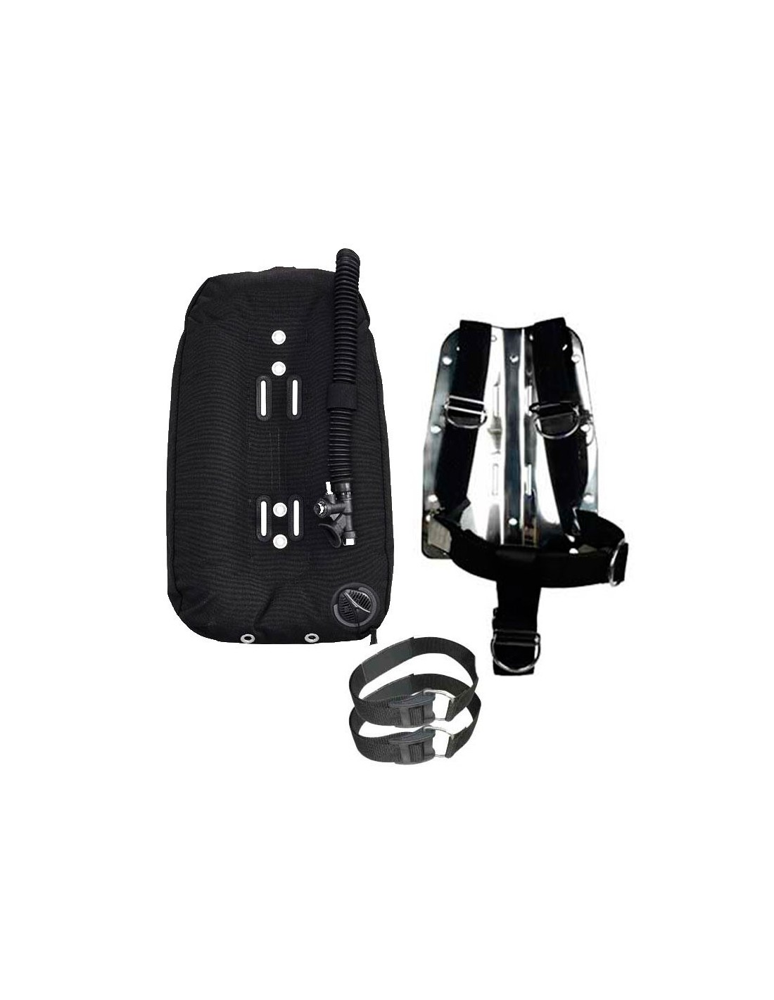 El conjunto se puede combinar con distintos elementos y montarlo así al gusto y necesidades de cada uno. Tomando como base del ala APEKS WTX-D30, podemos montar el equipo con distintos tipos de arneses, siempre con Backplate de acero Inoxidable 316L.
