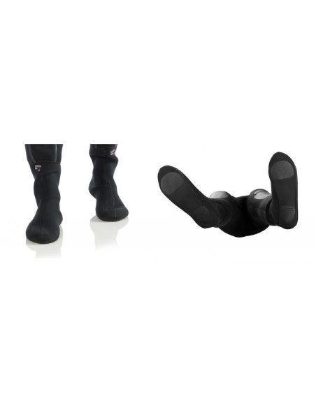 Escarpines sin suela con refuerzo restringido a las zonas de apoyo para no reducir la adaptabilidad a diferentes tallas de pie. Suela en tejido Black Diamond© de alta resistencia a la abrasión. De esta forma se facilita la gestión de stocks y pedidos, se mejora la termicidad del traje, se mantiene el tallaje de aleta habitual y se evita el punto crítico de la unión bota rígida–pantorrilla, una de las zonas con mayor nivel de rotura y filtraciones de agua en los trajes secos.