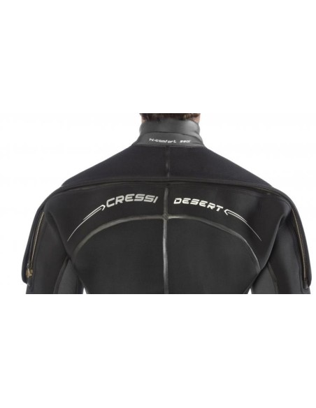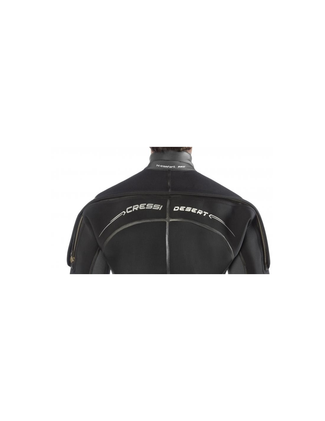 Además de su alta calidad de acabados en cuanto a costuras, termosoldados y patronaje, DESERT destaca por la utilización de neopreno precomprimido de 7 a 4 mm. Este neopreno tiene la ventaja de una excelente protección térmica en el fondo debido a su incompresibilidad, unida a una necesidad de lastre muy reducida. Reduce asimismo la necesidad de utilizar ropa interior de gran volumen como en los trilaminados.