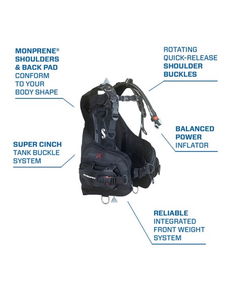 - El Hydros X se basa en el mismo diseño modular Monprene® con correas para hombros y back pad popularizado por el chaleco hidrostático de inflado posterior Hydros Pro.