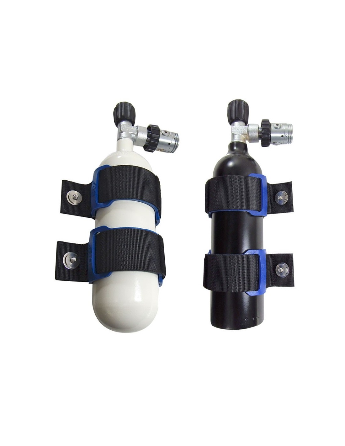 Los tanques de 0,85 litros y 1 litro vienen con correas para sujetarlos a la placa trasera. Los de 1,5 l están disponibles tanto con anclaje a la placa trasera como al tanque-bi-tanque. Y el tanque de 3l viene con las correas para sujetarlos a la botella o bibotella