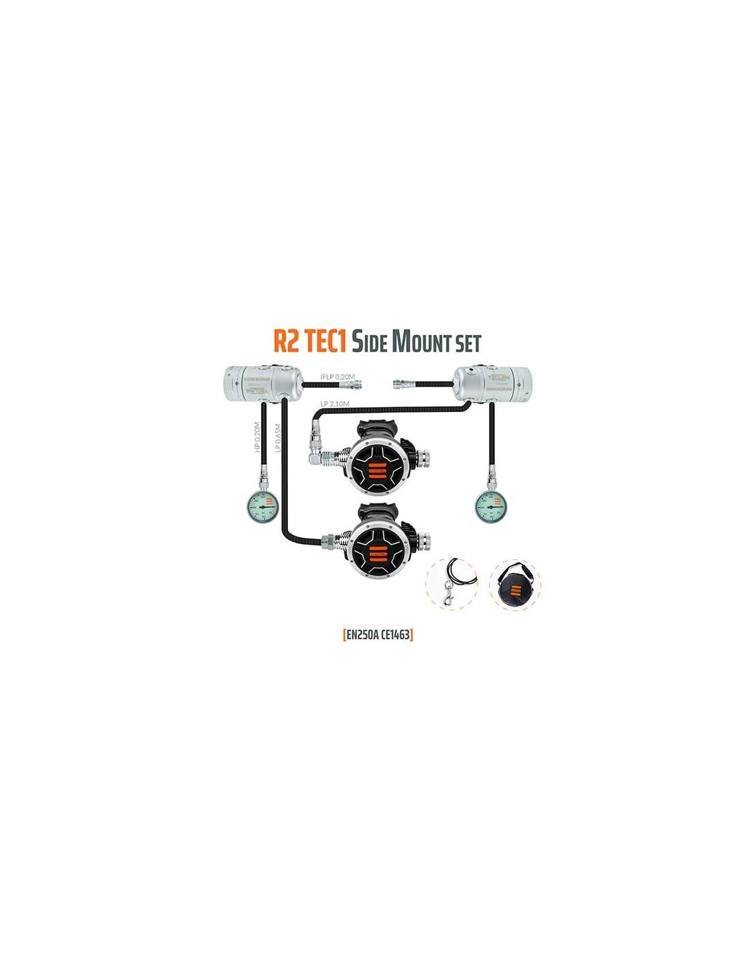 Set específico para Sidemount compuesto por Dos 1ªs etapas Tecline R2 con 5º Puerto de membrana compensada, torreta giratoria y cámara estanca, Dos 2ªs etapas TEC1 y Dos manómetros.