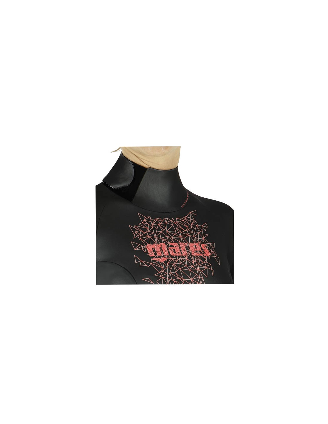 - Nuevo diseño de cuello hidrobarrera"" El traje de apnea femenino Horizon 2.0 presenta un nuevo gráfico de colores.