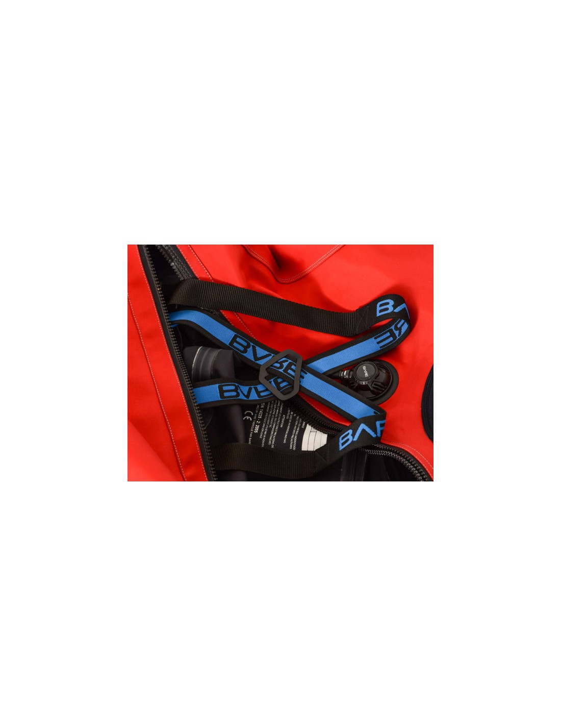 La almohadilla de respaldo de la válvula del inflador extraíble reduce la incomodidad como resultado del "apretar" en las profundidades. La almohadilla de respaldo está hecha de material espaciador 3-D no compresible que proporciona un flujo de aire sin restricciones cuando se presiona contra el pecho del buzo.