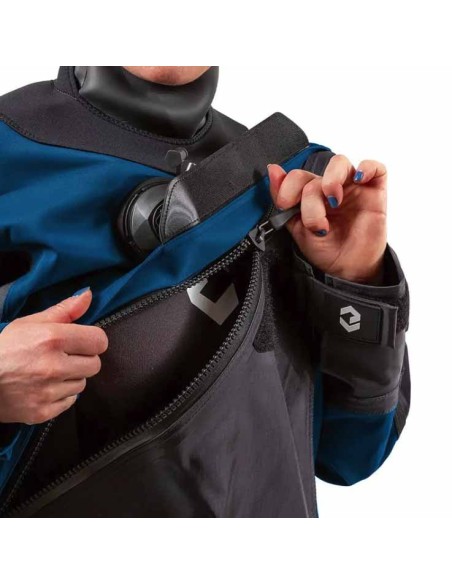 El patrón permite total libertad de movimiento, haciendo que su uso y consecuentemente la inmersión, sea cómoda y también mas segura, y evita que el exceso de aire se mueva dentro del traje. El sellado del traje seco utiliza una cremallera TiZip, protegida por una solapa desde el hombro hasta la cadera. Las válvulas de inflado y sobre presión/vaciado son de alto rendimiento. La válvula de inflado permite la conexión de sistemas calefactables (mediante actualización) y la válvula de vaciado se puede ajustar según el perfil de la inmersión. Los sellos de muñeca son cuellos de botella HD y están hechos de látex de alta resistencia.
